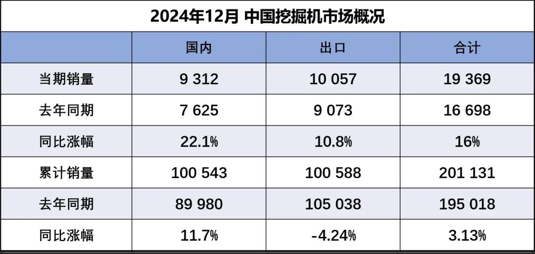 2025-01據(jù)中國(guó)工程機(jī)械工業(yè)協(xié)會(huì)對(duì)挖掘機(jī)主要制造企業(yè)統(tǒng)計(jì),2024年12月銷售各類挖掘機(jī)19369臺(tái),同比增長(zhǎng)16%。其中國(guó)內(nèi)銷量9312臺(tái),同比增長(zhǎng)22.1%;出口量10057臺(tái),同比增長(zhǎng)10.8%。2024年,共銷售挖掘機(jī)201131臺(tái),同比增長(zhǎng)3.13%;其中國(guó)內(nèi)銷量10054…......