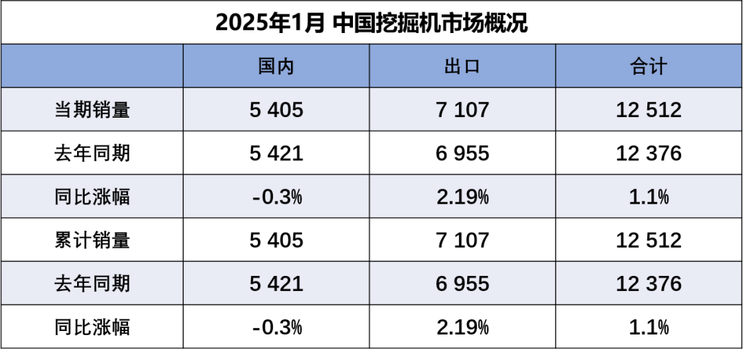 據(jù)中國(guó)工程機(jī)械工業(yè)協(xié)會(huì)對(duì)挖掘機(jī)主要制造企業(yè)統(tǒng)計(jì),2025年1月銷售各類挖掘機(jī)12512臺(tái),同比增長(zhǎng)1.1%。其中國(guó)內(nèi)銷量5405臺(tái),同比下降0.3%;出口量7107臺(tái),同比增長(zhǎng)2.19%。2025年1月…...